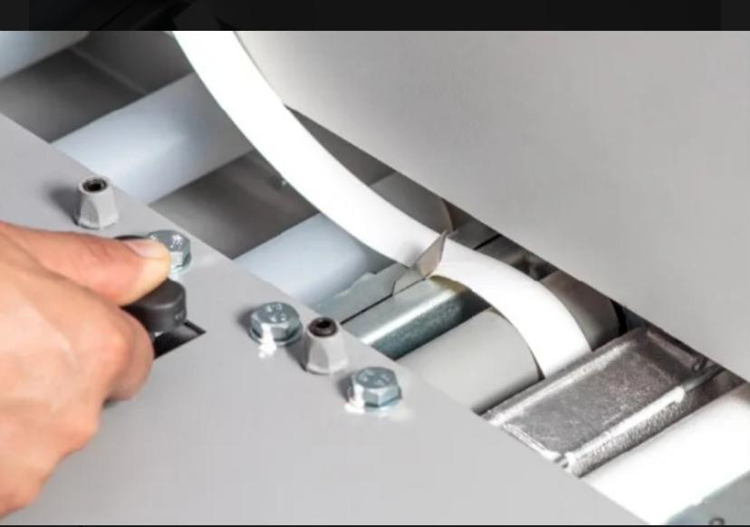 O equipamento pode ser usado para colar, refilar, pular e destopar com extrema qualidade e com avanço automático.