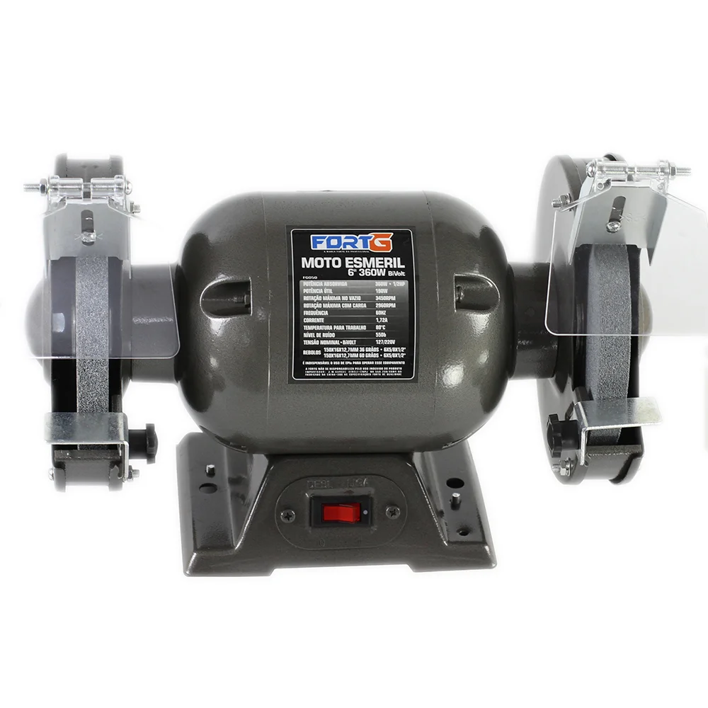 O Moto Esmeril de 6 polegadas Bivolt FG050 traz o melhor custo-benefício da categoria, com motor potente de 360W e rotação de até 3580RPM. Além disso, o motor tem o enrolamento feito em cobre, o que leva o produto a ter uma maior vida útil comparado a produtos com enrolamento em alumínio. O Moto Esmeril FORTG PRO também vem com dois rebolos de 6” cada e com gramaturas diferentes para diversificar as aplicações. É equipado com acessórios de segurança, como: Protetor de Cavacos transparente e ajustável, que possibilita a visualização completa da peça durante a execução do trabalho. Esse é um produto recomendado para trabalhos de desbaste, polimento, afiação, etc., e sua aplicação se dá em diversas áreas como artesanatos, chaveiros, cutelarias, oficinas mecânicas, serralherias, marcenarias, entre outras.