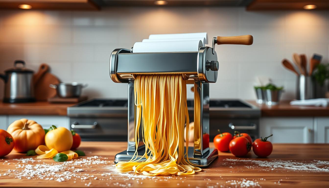 - Uma máquina de macarrão ajuda a criar diferentes tipos de massas.
