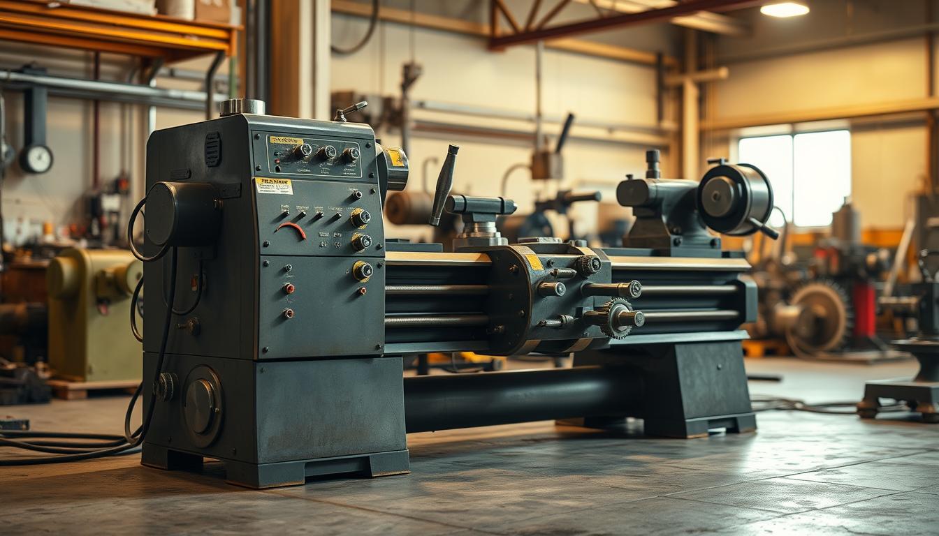 Um torno industrial é essencial para trabalhar com peças metálicas. Ele faz torneamento, faceamento e furação. É muito usado em várias indústrias.