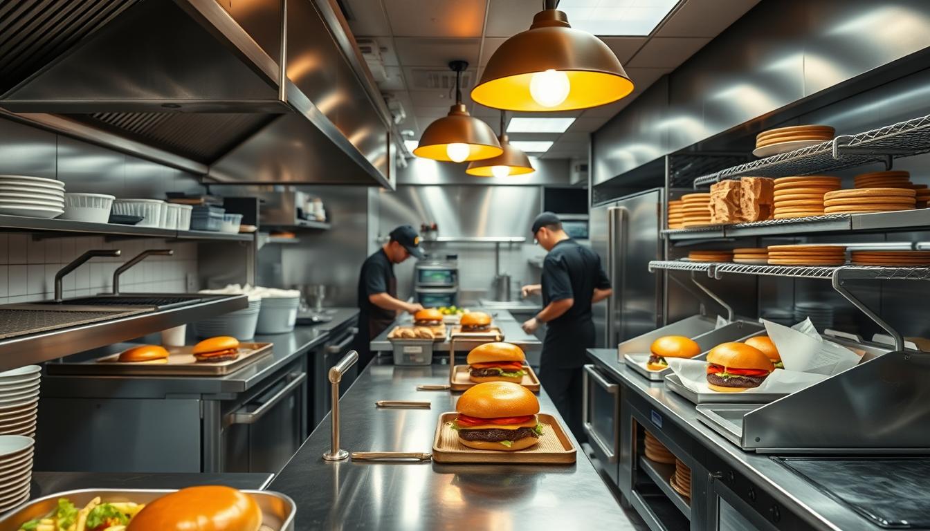 Hamburgueria moderna com equipamentos profissionais e ambiente decorado