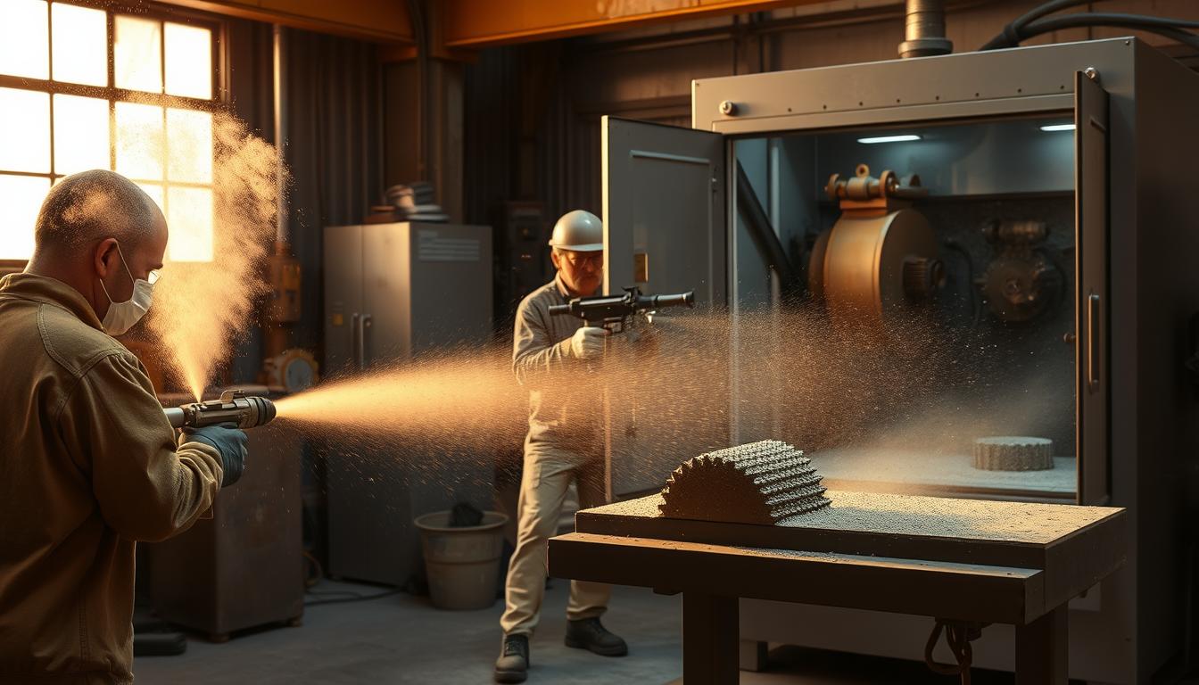 A técnica de jateamento mudou muito. Começou com areia e agora usa granalha e microesferas. Essa mudança fez o processo mais preciso e eficaz.