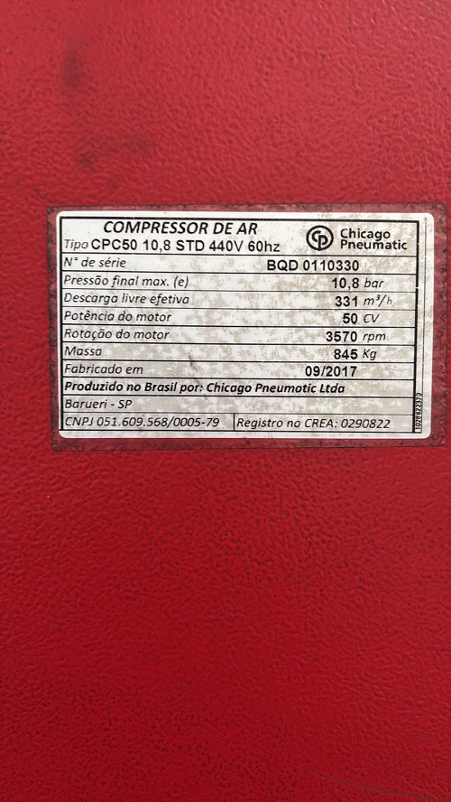 Compressor De Ar Parafuso Chicago CPC 50 CV 200 Pés 10,8 Bar 2017 C8325