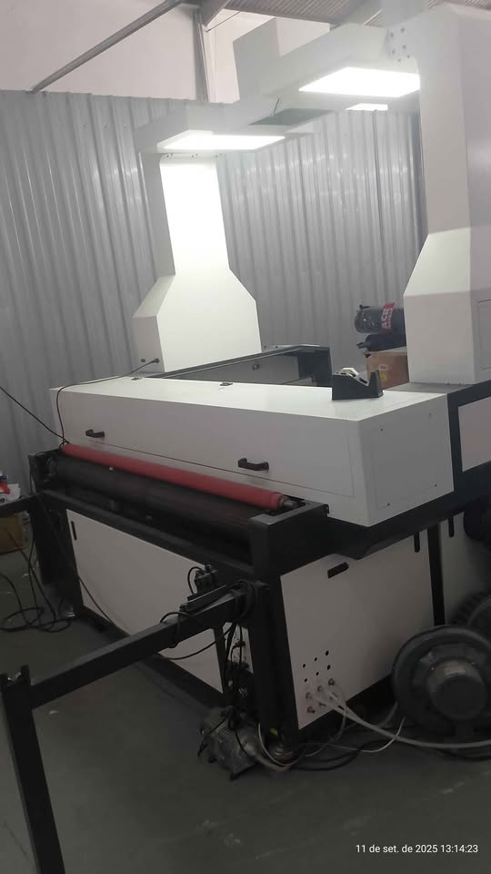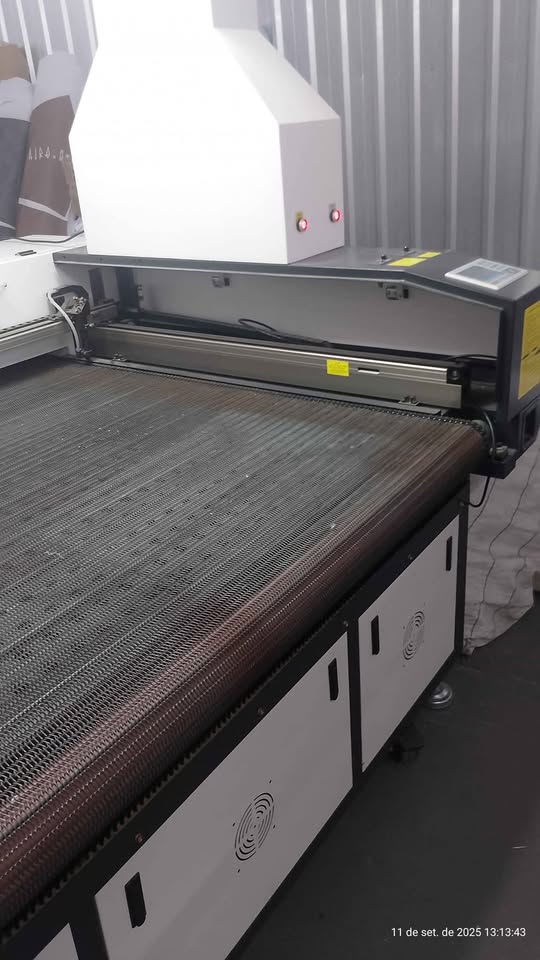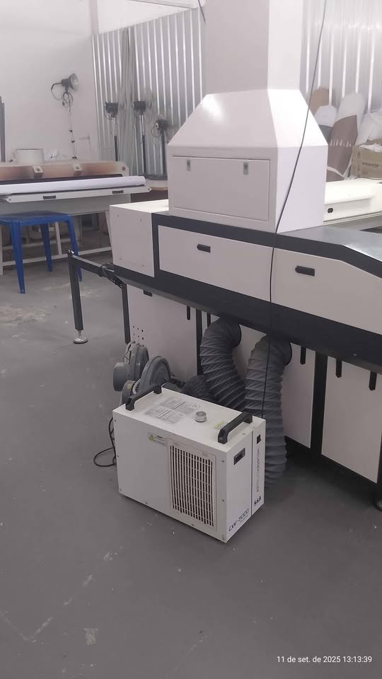 Máquina completa com exaustores e câmera e cabos em pleno funcionamento. Máquina de alta precisão e qualidade no corte, velocidade e produtividade elevadas e ainda permite cortes complexos e detalhados.