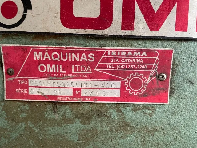 ? Características principais: ? Fabricante: OMIL - Ibirama / SC ? Modelo: DES 400 ? Tipo: Desempenadeira ? Mesa: 2300 x 400 mm ? Motor trifásico ? Construção pesada em ferro fundido, garantindo estabilidade e durabilidade ? Sistema de acionamento com correia e polia ? Máquina nacional, simples de operar e de fácil manutenção