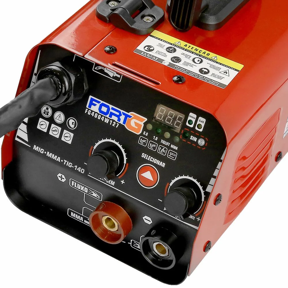 A Máquina de Solda Multi Processo MIG MMA TIG Lift FG4004W é peculiar nos seus processos de soldagem e altamente eficiente, não apenas por possuir os três dos principais métodos de soldagem utilizado no mercado Brasileiro , mas também devido à amperagem aplicada em cada tipo de processo, ampliando o leque de possibilidade de aplicação. O processo de MMA, faz uso de eletrodos com espessuras variáveis, possibilitando trabalhos rápidos de ponteamento. O processo TIG Lift, com o auxílio de uma Tocha TIG Seca (não inclusa) proporciona o uso de eletrodos especiais para soldagem de materiais diversos. E por fim, o processo MIG propõe o uso com arames de solda sem gás, o que agiliza a soldagem além do resultado no acabamento diferenciado em relação aos outros processo. Multiprocesso com fácil troca entre processos, manuseio intuitivo e transporte devido ao seu tamanho compacto e alça rígida, além de possuir opção de configuração para cada tipo de diâmetro de eletrodo e espessura de placa a soldar, com painel digital, dando maior precisão nos trabalhos executados.