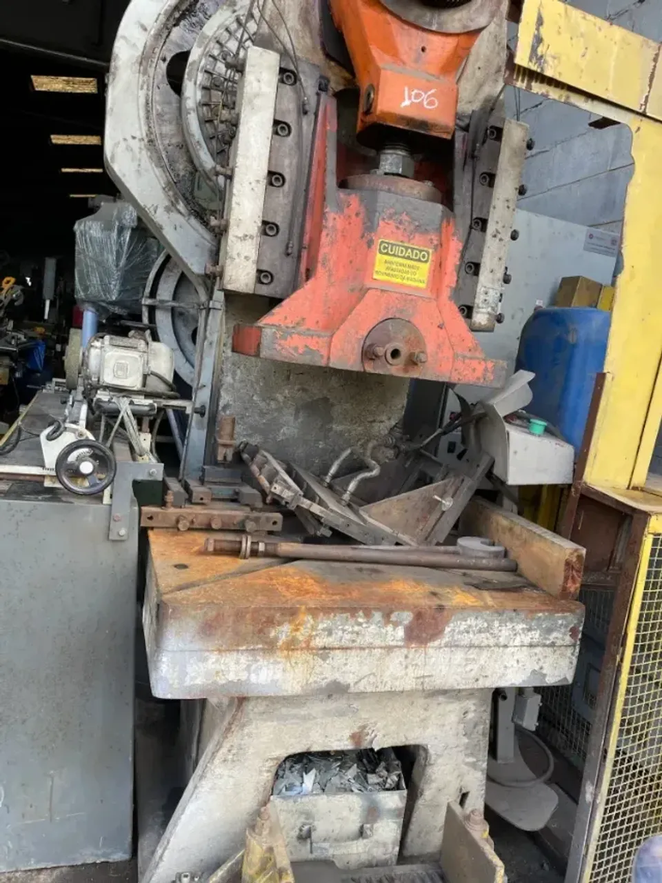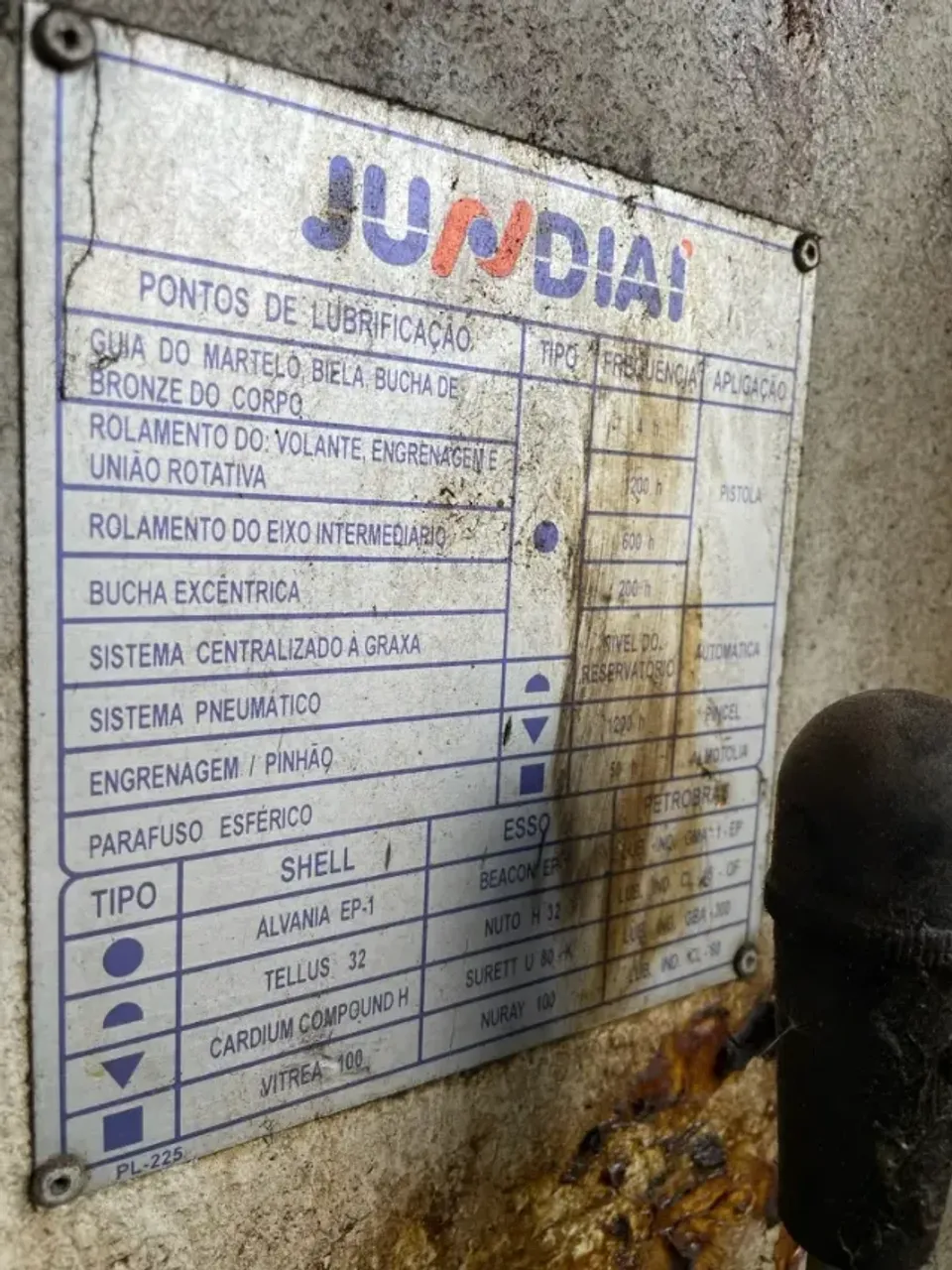 Marca: Jundiaí Tipo: Prensa de fricção / freio de fricção Capacidade: 100 toneladas Sistema: Volante com embreagem e freio de fricção Estrutura: Corpo em ferro fundido, robusto e resistente Lubrificação: Sistema completo com tabela original de lubrificação Ideal para: Estampagem, repuxo, corte e conformação de metais
