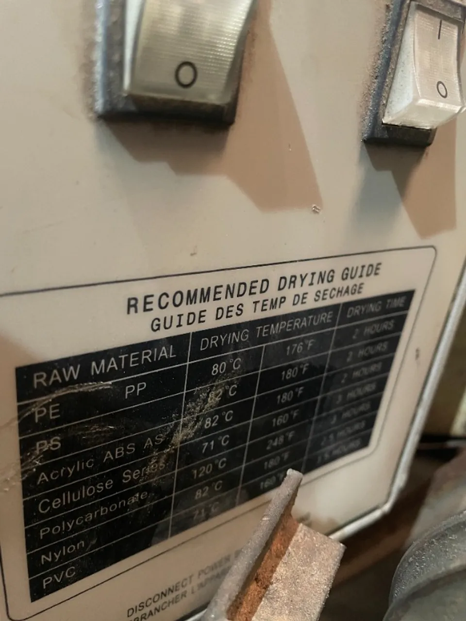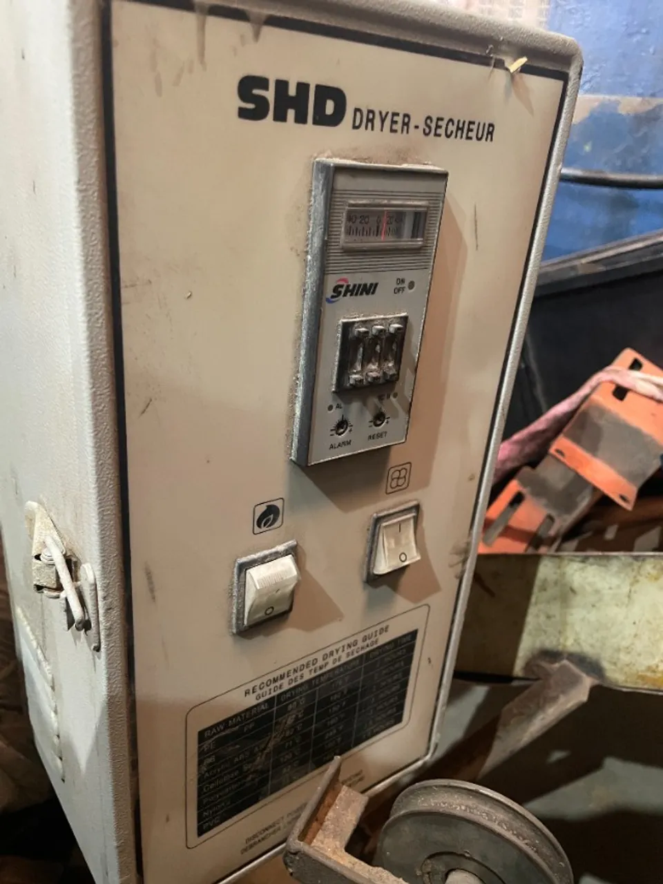? Marca: Shini ? Modelo: SHD Dryer-Sécheur ? Usado para secagem de grânulos/resinas plásticas antes da injeção ou extrusão. ? Cuba em aço inox com peneira interna. ? Painel de controle com termostato, timer e guia de secagem para diversos materiais (PE, PP, PS, ABS, PC, Nylon, PVC etc.). ? Aquecimento uniforme e ventilação forçada, eliminando umidade e melhorando a qualidade das peças moldadas.